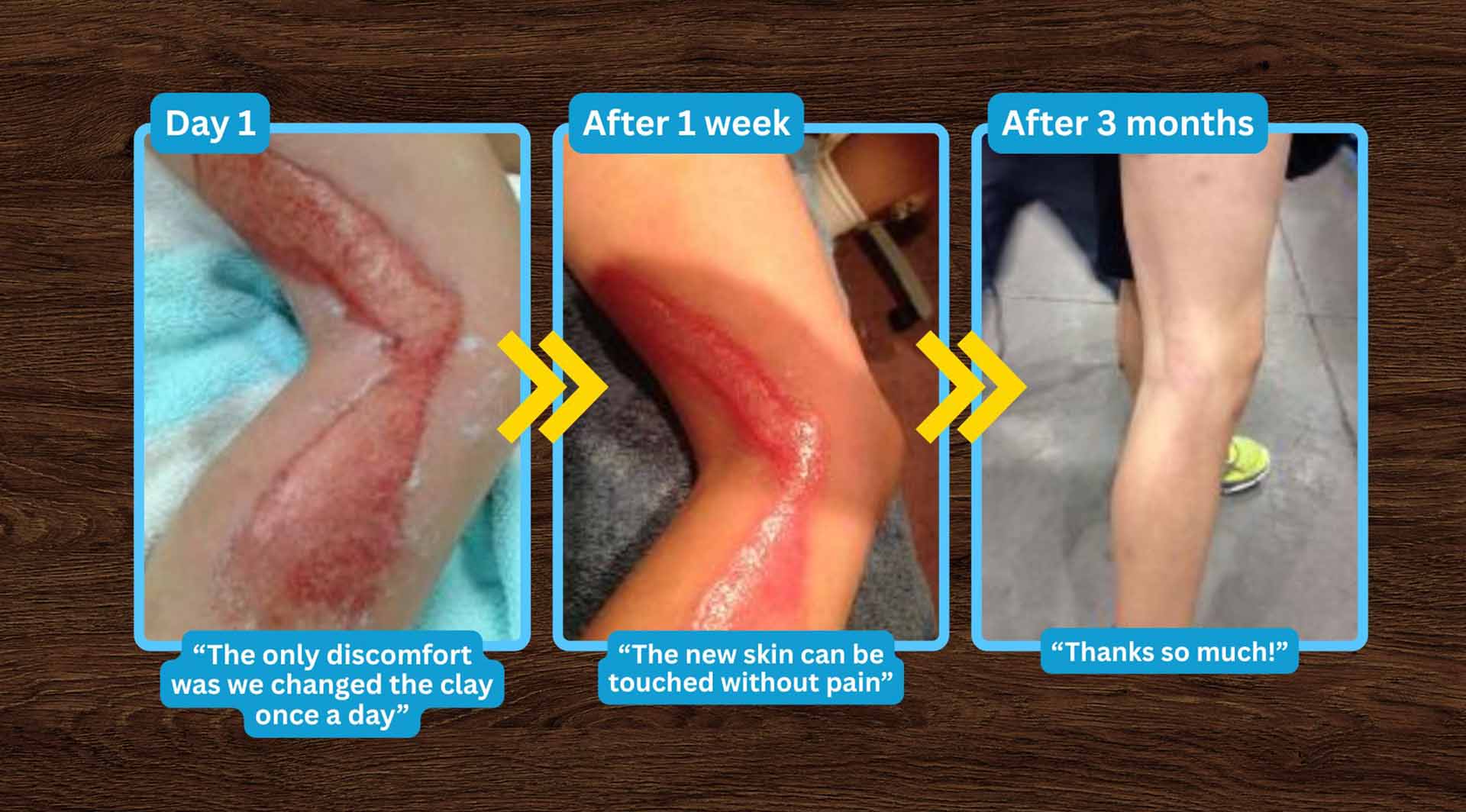 Third-degree burn healed with clay gel in days. Pain dropped from 10 to 2 within 15 minutes of application.