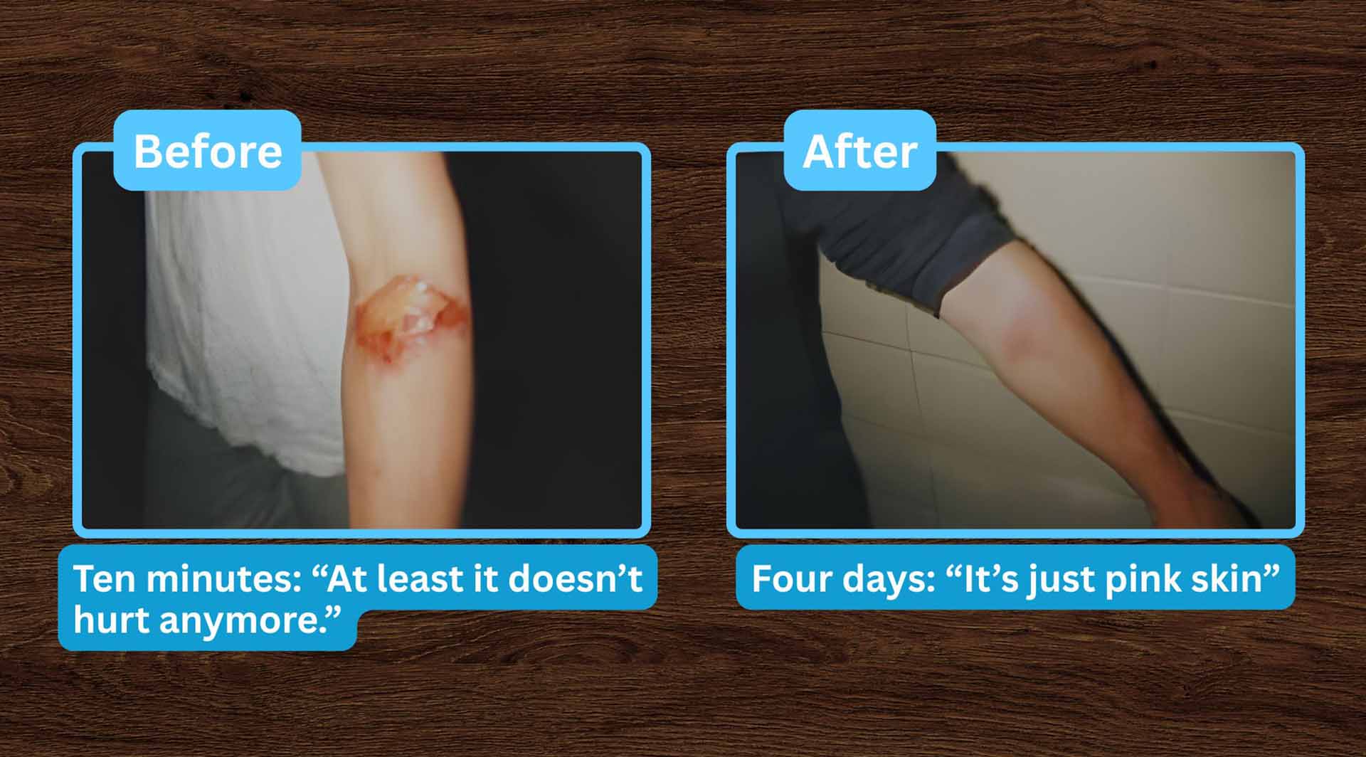 An 8-year-old pinned by a treadmill. Clay gel applied immediately — new skin touchable without pain after just one week.