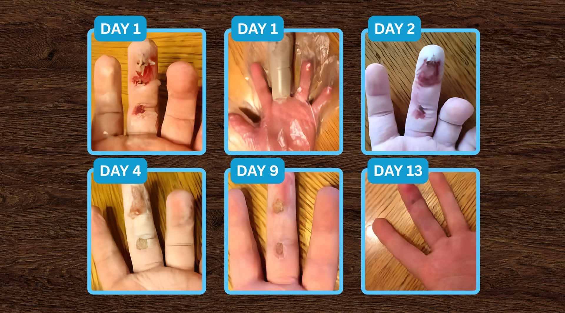 A 9-year-old's hand run over by a go-kart. Packed in clay daily — healed in 13 days with minimal pain.